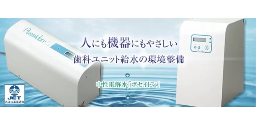 中性電解水生成装置「ポセイドン」は、設置するだけで自動的に遊離残留塩素濃度を補正することができるので、歯科ユニット給水の清浄化が期待できます。